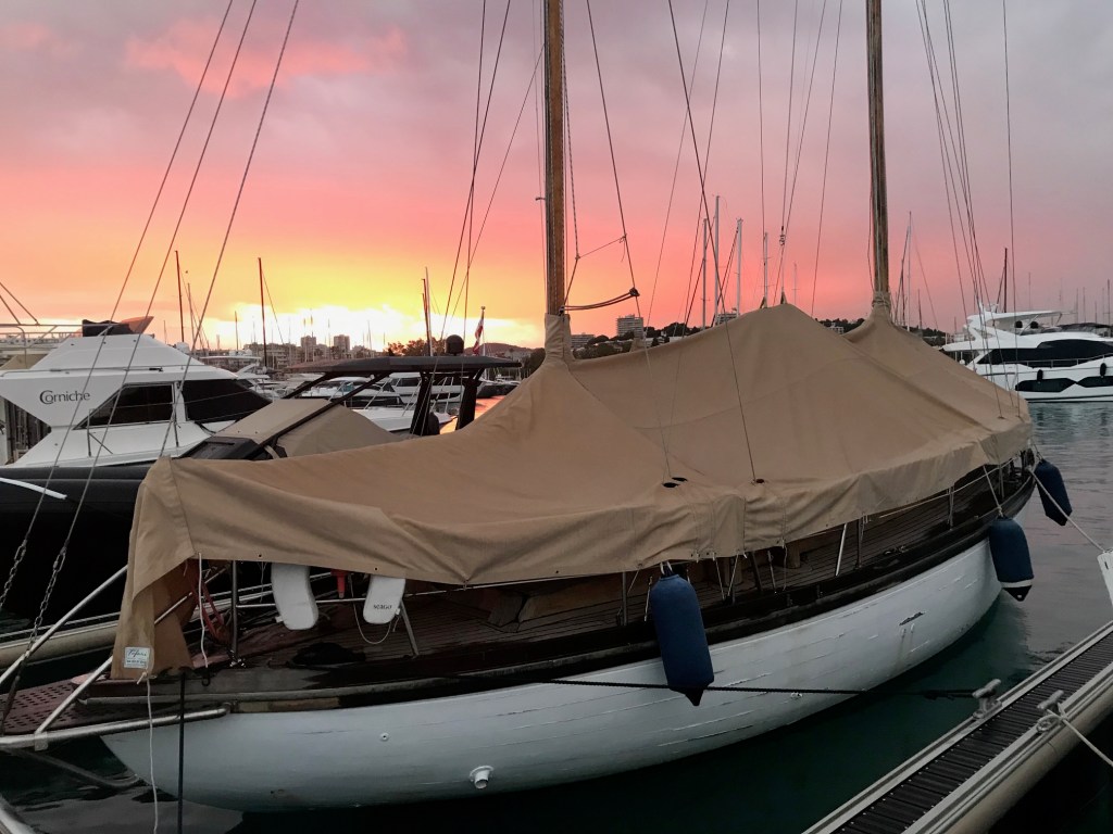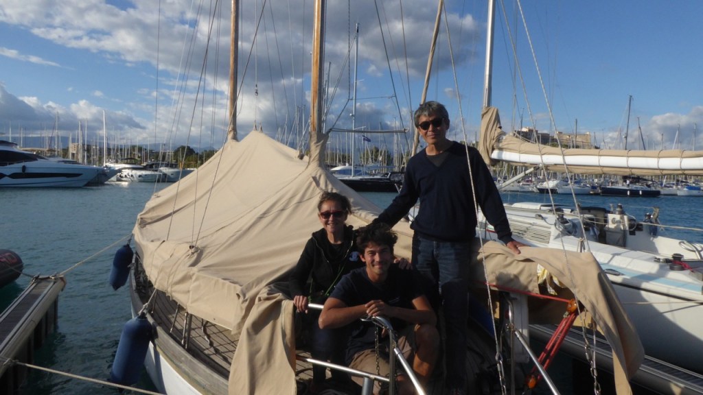 Le nouveau port d’attache de Kalaïs en vue, port Vauban à AntibesL’équipe au grand complet à l’arrivée, après avoir baché le bateau en prévision de la pluie.Bonne nuit Kalaïs, bravo pour cette première traversée!
