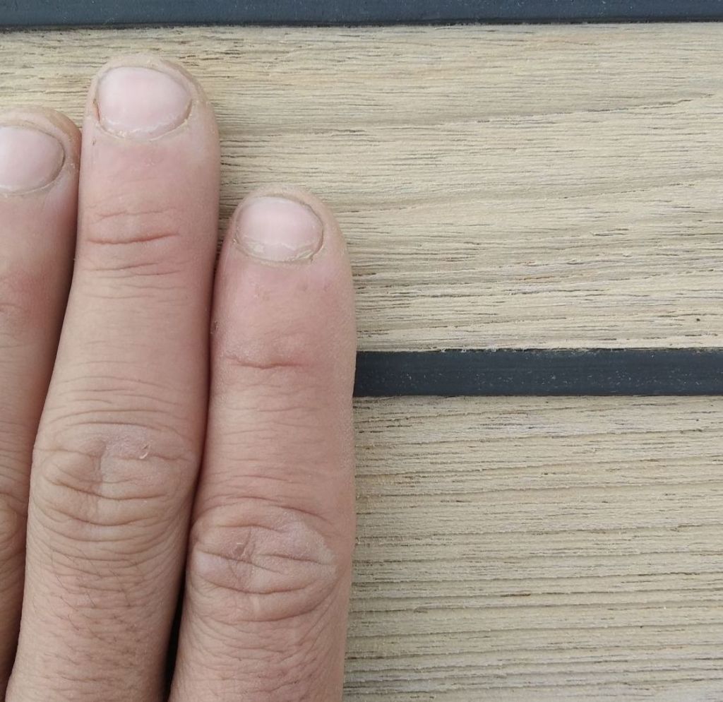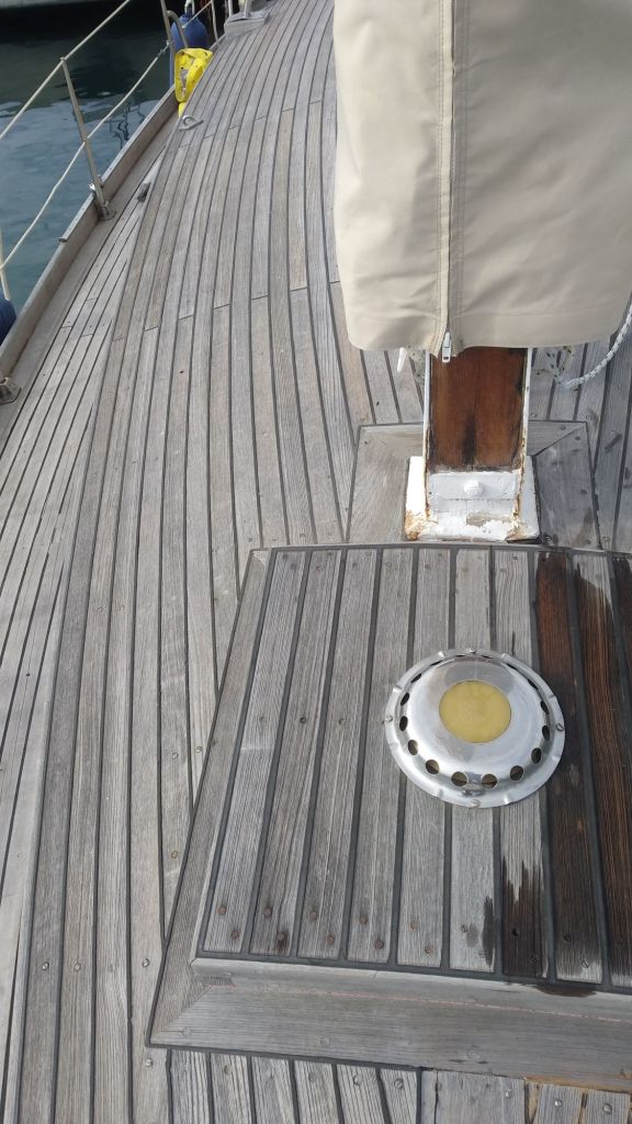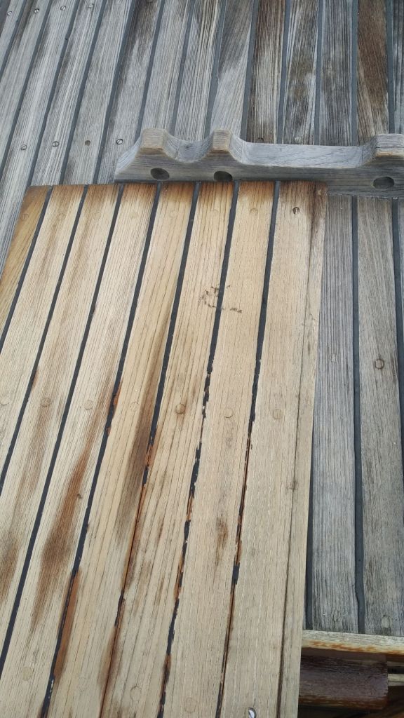 Quand j’ai acheté le bateau les bois extérieurs étaient tous gris, plus de vernis, érosion du bois, UV, sel, etc…