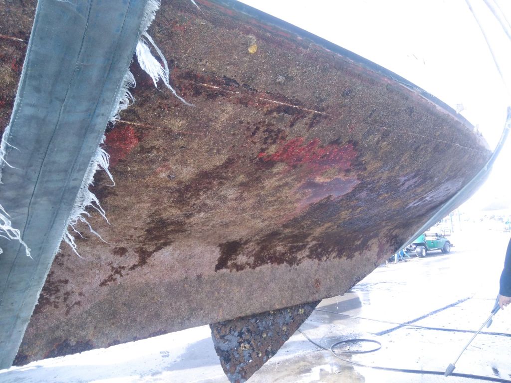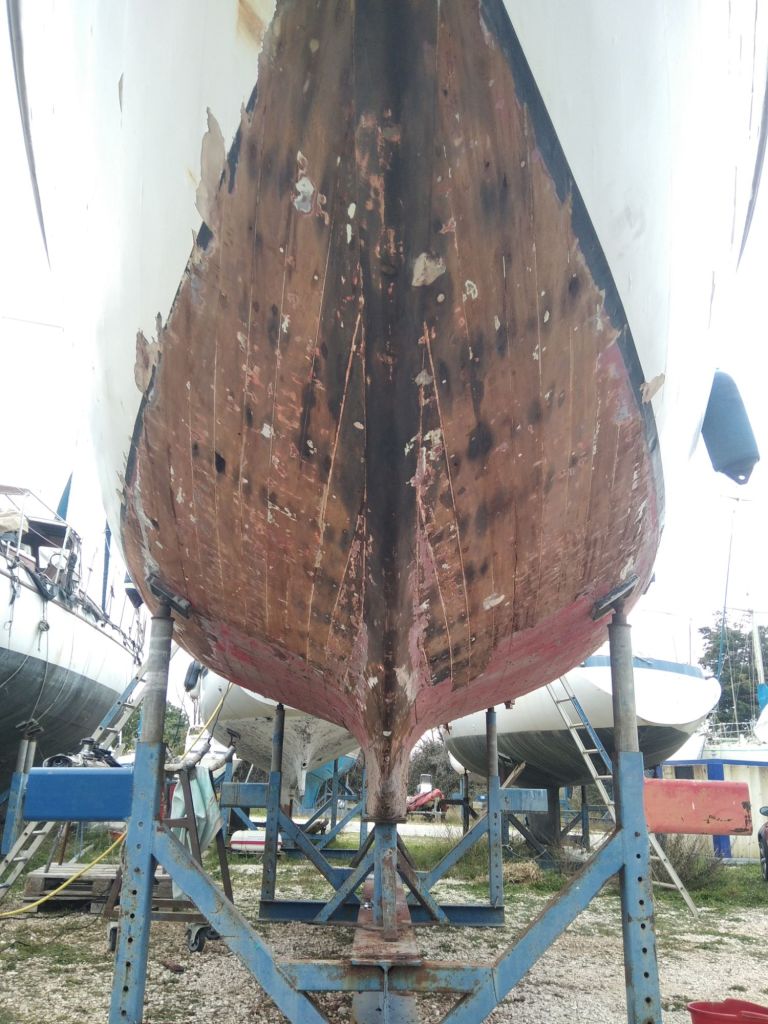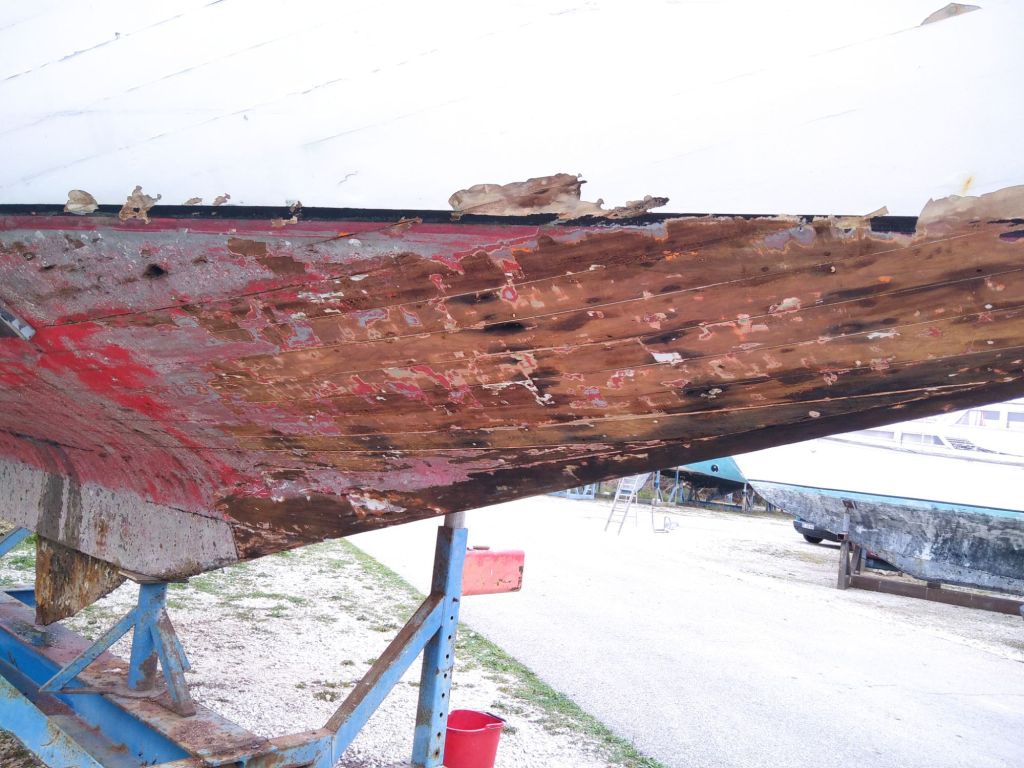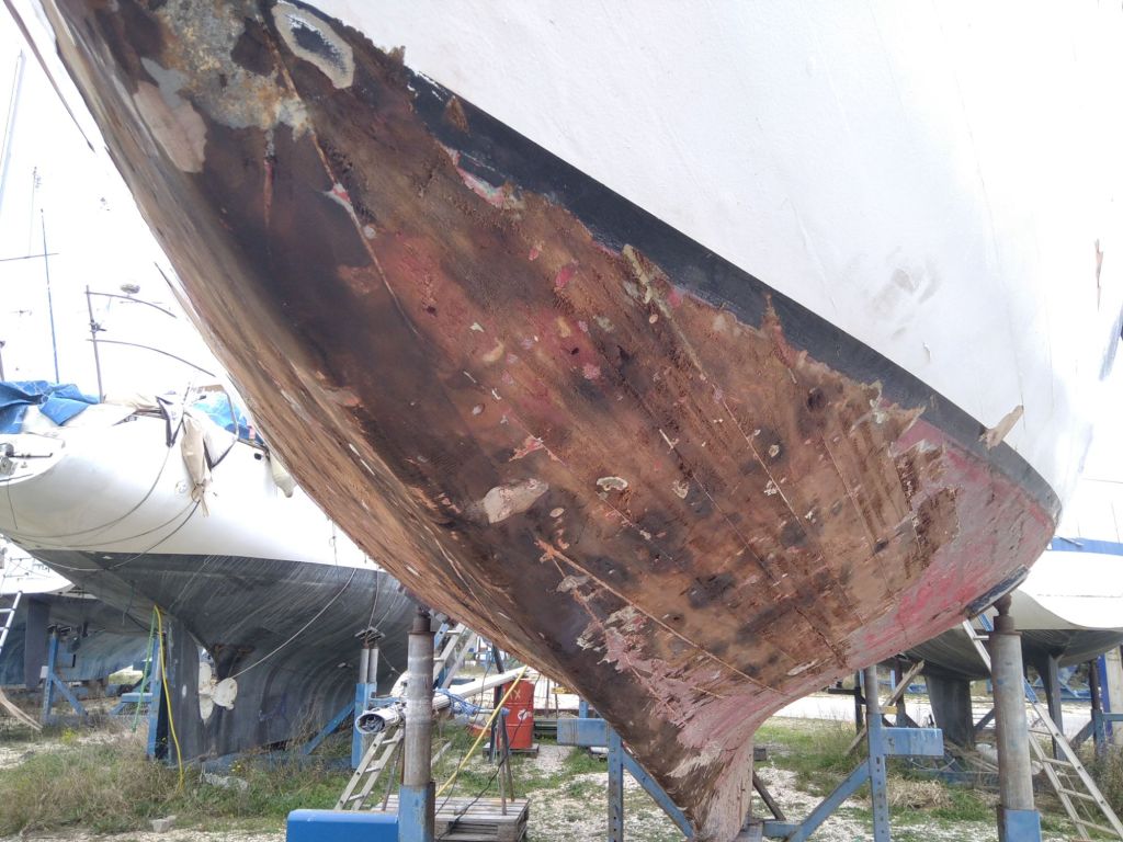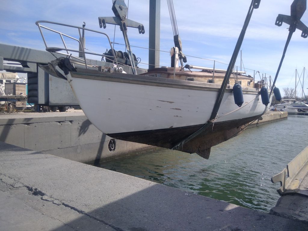 Flamands roses à l’arrivée, on est bien aux portes de la camargue Après dematageLevageLe parc à huîtres On commence à décaperAprès 2h de taf, j’ai fais 1m50… À l’endroit le plus étroit du bateau, ça promet!Après décapage et ponçage… C’est toujours pas très beau mais on progresse.
