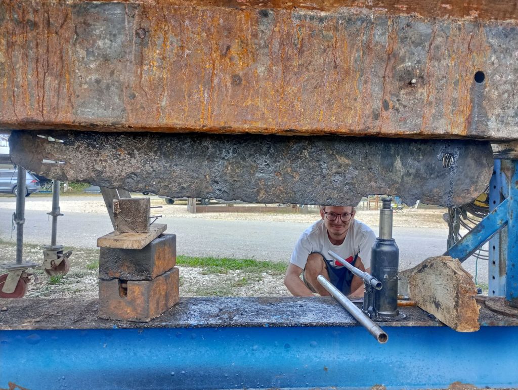 Pour monter la dérive, j’ai mis un cric hydraulique (8T) dessous, au début ça faisait monter tout le bateau, à force la dérive a commencé à rentrer petit a petit.